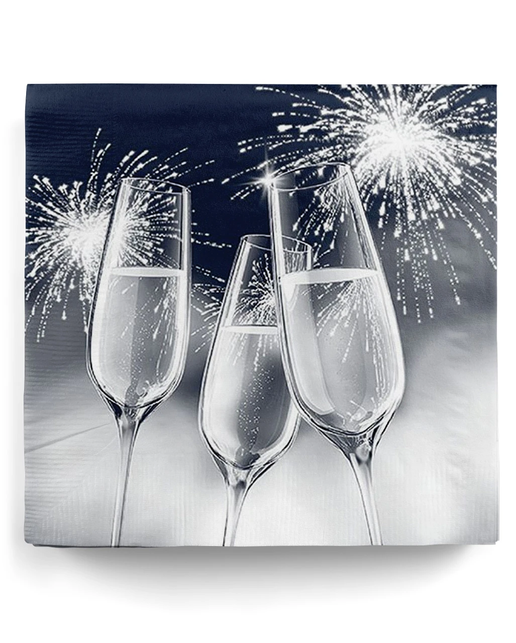 Für besondere Festlichkeiten sind diese wunderschönen Papierservietten wie gemacht. Die Servietten mit Sektglas-Motiv zeigen drei anstoßende Sektgläser vor einer Feuerwerks-Kulisse. Sollte dir also noch die richtige Tischdeko für Silvester, Jubiläumsfeier, Gala-Party oder Geburtstag fehlen, dann sind diese bezaubernden Festtags Servietten wahre Retter. Durch den festlichen Aufdruck und ihre dezenten Farben sind 20 blaue Papier-Servietten mit Sektgläsern ideal als Silvester Deko.