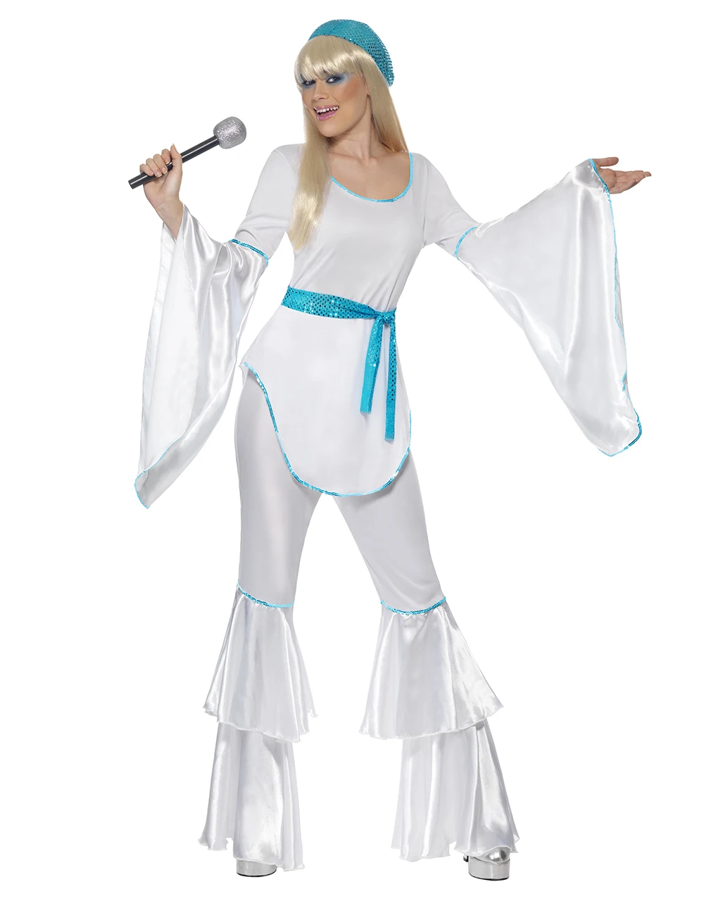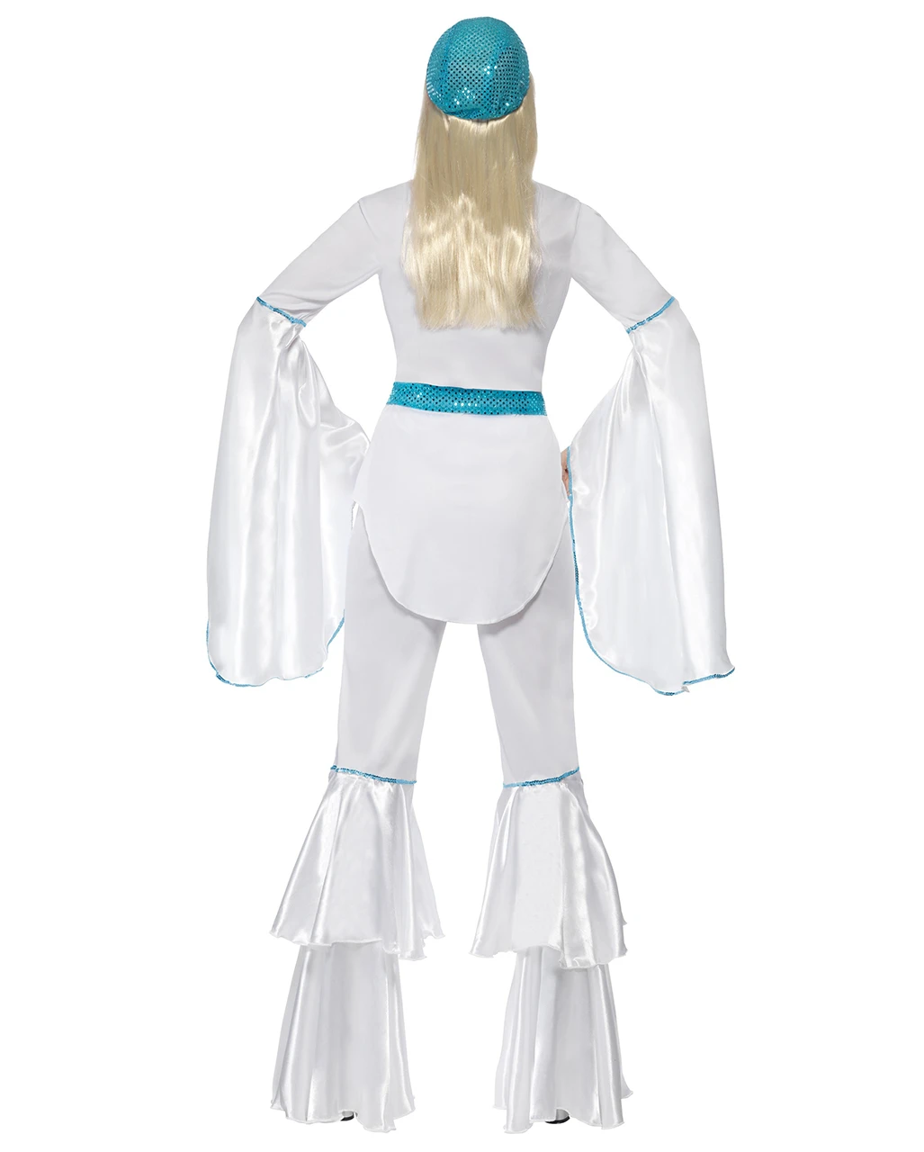 Das weiße Disco Queen Outfit bestehend aus Top mit türkiser Umrandung, der Schlaghose, dem Gürtel und der Haube. Das Top hat typisch für diese Zeit Trompetenärmel. Die Schlaghose ist eine Doppelschlaghose. Die türkise Haube ist mit Pailletten versehen. Die Mary Janes Pumps weiß Gr. 36/37 ist ein elegantes Schuhwerk zu deinem Hippie Disco Kostüm.