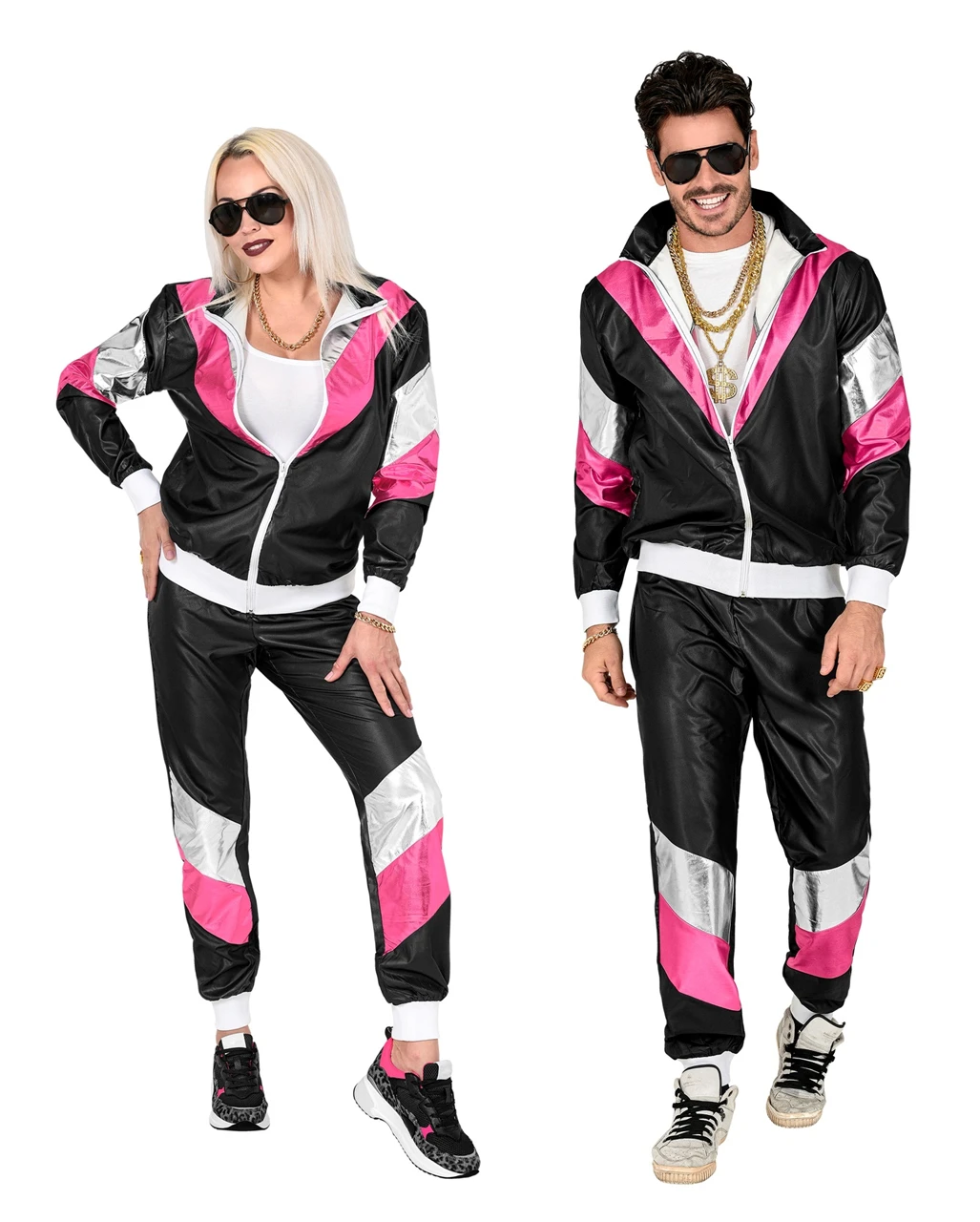 Der 80’s Retro Trainingsanzug ist Unisex und passt allen Geschlechtern. Mit der Farbgestaltung in Schwarz-Pink und Silber passt dieser perfekt in das Zeitalter von Disco, Schlager und fröhlicher Popmusik. Zweiteilig, bestehend aus Oberteil mit Reißverschluss und Hose mit Gummizug, lässt sich Trainingsanzug schnell und einfach an- und ausziehen. Jetzt noch ein paar Goldketten um den Hals, eine Spiegelbrille oder die damals beliebte „Schnelle Brille“ aufgesetzt, und fertig ist dein Mottoparty-Outfit!