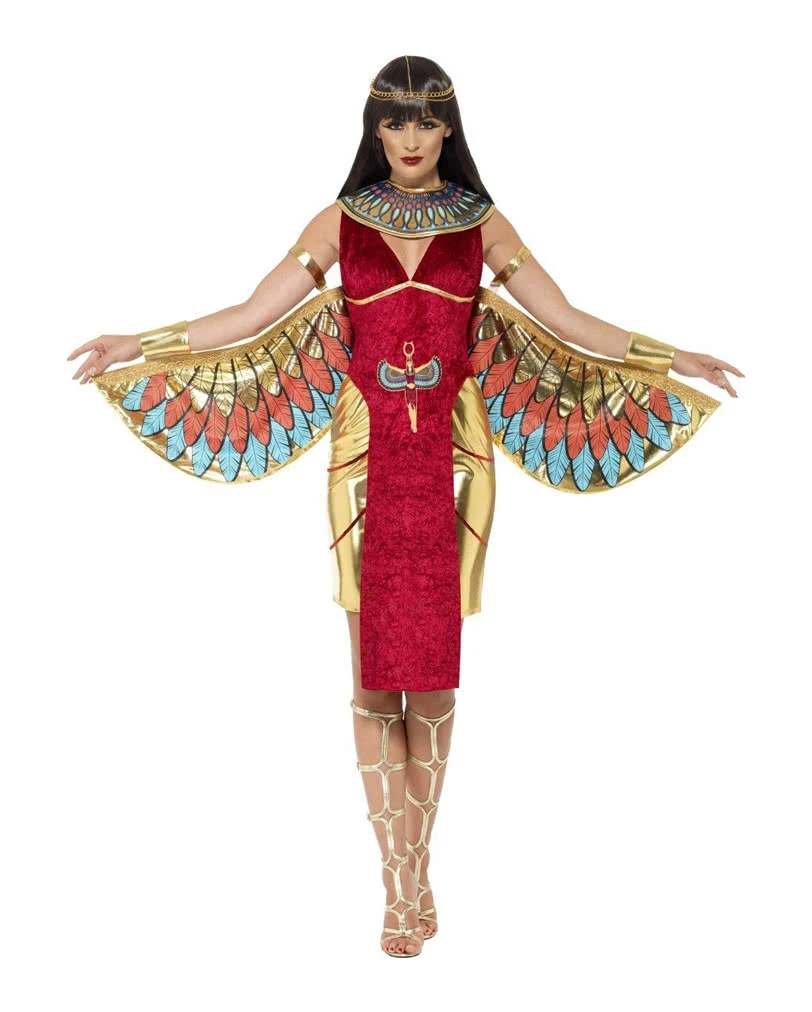 Das Göttin Isis Damenkostüm besteht aus einem roten Kleid mit goldenem Unterrock und ca. 80 cm langen Flügeln. Auf dem Kleid ist auf der Vorderseite die Göttin Isis aufgedruckt und die Flügel haben rote, blaue und goldene Federn aufgedruckt. Mitgeliefert wird ein großer Halsschmuck mit Verzierungen und eine goldene Kette als Kopfschmuck. Wir haben auch noch weitere ägyptische Kostüme in unserem Sortiment wie das Ägyptisches Kostüm oder das Cleopatra Kostüm aus Lurex.
