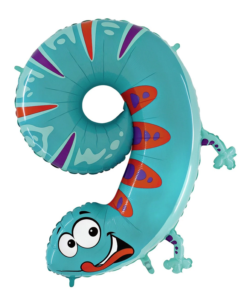 Der Animaloon Zahl 9 Eidechse ist ein süßer Geburtstags Folienballon für Reptilienfreunde. Mit dem bunten Gecko feierst du deinen 9. Geburtstag oder ein anderes 9-jähriges Jubiläum und wirst dabei von einem süßen Reptil angelächelt. Der Geburtstagsballon mit der „Neun“ ist durch das süße Tiermotiv perfekt für Kindergeburtstage.