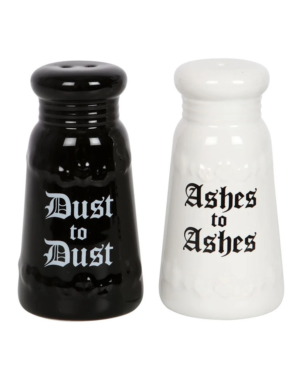 Bestelle dir jetzt das exklusiven Asche zu Asche Salz & Pfeffer Set und hole dir damit eine stimmungsvolle Halloween Homeware ins Haus. Die Gewürz Streuer sind je 10 x 5 x 5 cm groß. Einer der Streuer ist schwarz und mit der weißen Aufschrift „Dust to Dust“ versehen, der zweite Streuer ist weiß und trägt die Aufschrift „Ashes to Ashes“. Das Geschirr kann auch prima als Gothic-Wohnaccessoire gerne an Gruftis & Heavy Metal Fans verschenkt werden. Wie wäre es mit dem Totenschädel Bierglas 400ml für dein morbides Halloween Dinner?