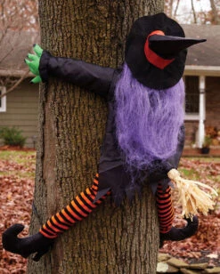 Gegen den Baum geflogene Hexe als witzige Halloween-Dekoration