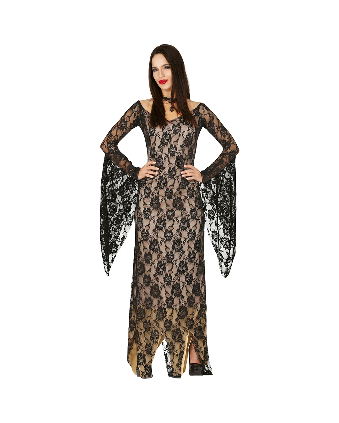 Unser Dark Lady Spitzen Damenkostüm ist eine edle Robe für Halloween. Sie besteht aus einem beigfarbigem Unterkleid auf welchem ein schwarzer Spitzenstoff liegt. Das Kleid verfügt über weite Trompetenärmel, die dir einen femininen Look verleihen. Passend zu deinem glamourösen Kleid bekommst du die Schwarze Godiva Damenperücke ebenfalls bei uns im Shop!