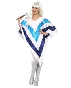 Der Disco Poncho überzeugt durch seinen authentischen 70er-Look und die schicke weiß/blau/lila Farbkombination. Um deinen Retro-Kostüm zu komplettieren, empfehlen wir die Disco Brille rot mit Punkten und das Glitter Make Up Grün.