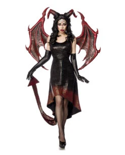 Das Drachen Lady Kostüm mit Flügeln verwandelt dich in eine betörende Dragon Queen. Trage das Fantasy Damenkostüm im Dragon-Look und lege einen sexy Auftritt hin! Die Verkleidung mit Drachenflügeln besteht aus einem figurbetonten Vokuhila-Kleid mit schwarz-rotem Farbverlauf und Schwanzschleppe, Drachenflügeln, Hörnern und schwarzen Handschuhen. Du bekommst dieses Plus Size Kostüm für Damen bis Größe 3XL. Hierzu passt unsere Gothic Vampira Perücke
