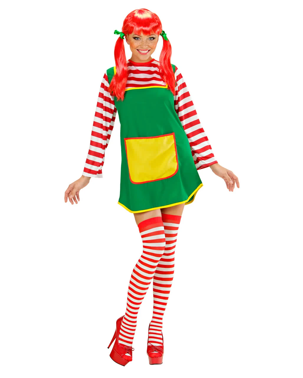 Das lustige freche Göre Damenkostüm besteht aus dem grünen Kleid mit angenähter Schürze und rot-weiß geringeltem Oberteil, das ebenfalls an dem Karnevalkostüm fest angenäht ist. Vervollständige dein Karnevalskostüm doch mit der roten Freches Mädchen Kinderperücke mit Zöpfen und schminke dir lustige Sommersprossen in das Gesicht. So verkleidet bist du der freche Wirbelwind, der wie im Kinderbuch alles auf den Kopf stellt.