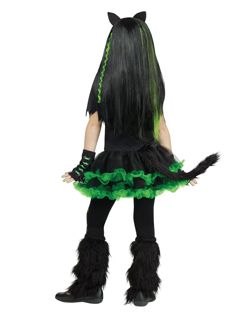 Das 5-teilige Katzen Kinderkostüm besteht aus einem schwarzen Minikleid mit vielen grün-weißen Kratzern von Katzenkrallen als Motiv und besitzt ein 3-lagigen Tüllrock mit jeweils neongrünen Abschluss. Auf der Rückseite des fantastisch aussehenden Katzenkostüms befindet sich ein schwarzer Katzenschwanz, während die Schultern zusätzlich mit Kunstfell ausgestattet sind. Die im Lieferumfang enthaltenen schwarze Leggings, zeigen ebenfalls grün-weiße Kratzer, während die fingerlosen Handschuhe mit einem grünen Band verziert sind. Den Abschluss bilden das Haarband mit Katzenohren und die Stiefelstulpen aus Kunstfell. Mit der Schminkfarbe „Pastellkatze“, der Halloween Kinderperücke grün und einer Katzen Nase kannst du das Kostüm noch perfektionieren.