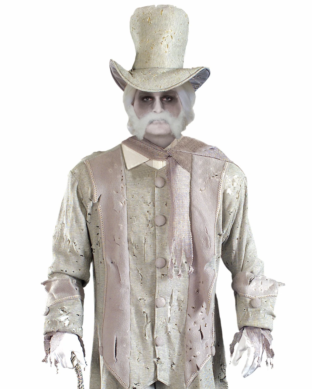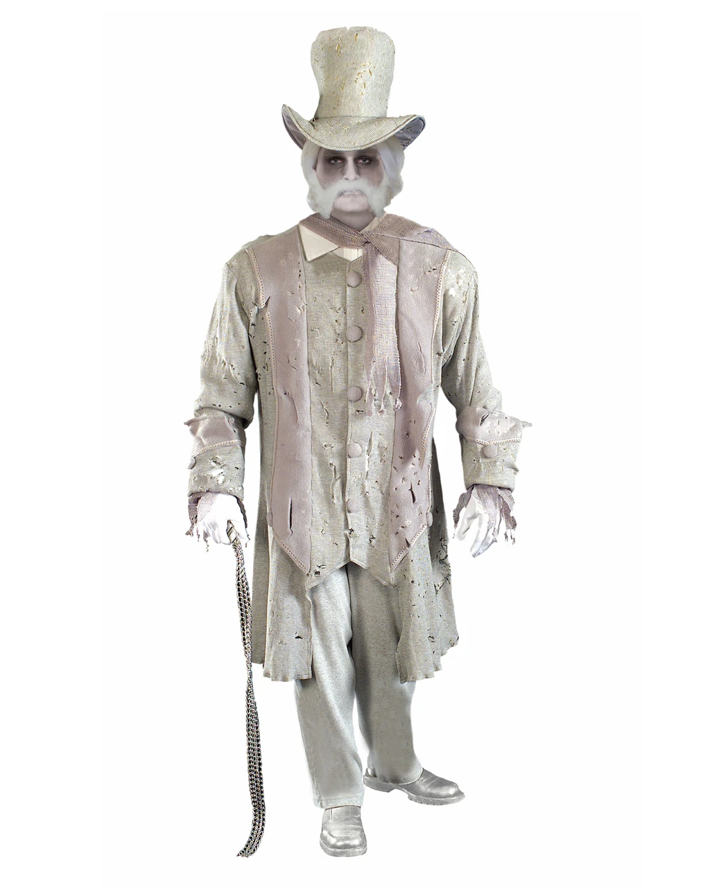 Das Geister Gentleman Männerkostüm ist eine Halloween Herren Verkleidung mit Stil. Das Geisterkostüm macht aus dir einen ehrwürdigen Herren, vielleicht ein verstorbener Adliger, mit Anzug und Zylinder. Das graue zerschlissene Jacket zeugt davon, dass du schon so manches Jahrzehnt oder gar Jahrhundert durch die Flure spukst. Passend gehört zu dem Geisterhaus Kostüm auch der graue Schal und eben auch der Zylinder. Dein Gesicht kannst du außerdem mit dem Gespenster Make-up Set 7-teilig perfekt in Szene setzen.