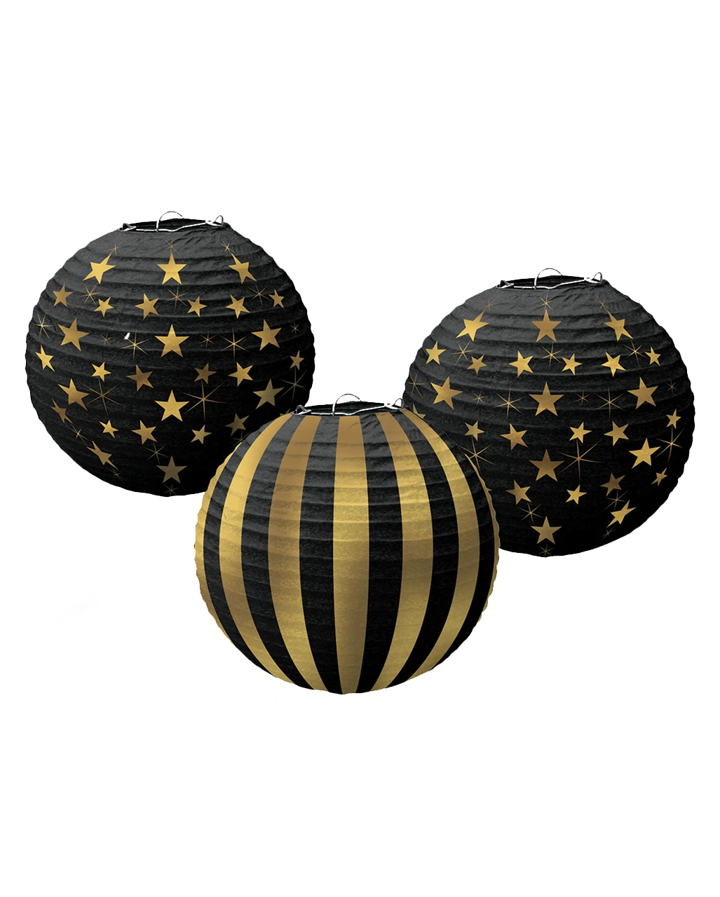 Für Fasching, Geburtstagspartys oder Mottofeten sind Lampions aus Papier eine geniale Deko-Idee. Unsere Glitz & Glam Lampions im Set 3 Stück sind eine schnelle Decken-Dekoration für deine Party-Location. Das Lampion Set enthält 3 schwarze Lampions mit Sternen und Streifen in Gold. Sorge für stimmungsvolle Akzente und dekoriere mit der Lampion Hängedeko von Karneval Universe!