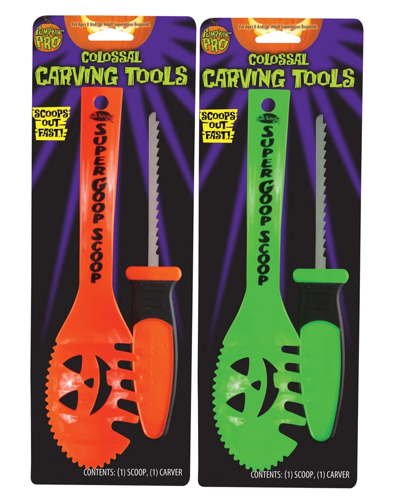 Um die Kürbisse in klassischer Halloween Marnier zu bearbeiten, brauchst du das richtige Kürbis Schnitzwerkzeug. Unser zweiteiliges Kürbis Schnitz Set besteht aus einem ca. 25 cm langen Kunststofflöffel und einer etwa 22 cm langen Säge mit Kunststoffgriff. Der Plastiklöffel dient zum Aushöhlen und ist rundherum in zwei verschiedenen Varianten, nämlich fein und grob gezahnt. Der Griff ist gebogen, damit ein besserer Halt beim Aushöhlen des Kürbis gewährleistet ist. Die Metallsäge hat ein feines bis mittleres Sägeblatt und ist damit ideal geeignet um die verschiedendsten Motive in den Halloween Kürbis zu schnitzen. Deiner Phantasie sind dabei keine Grenzen gesetzt und nachdem du dein Prachtstück erstellt hast, lässt die bunte Kürbis LED Beleuchtung deine Kürbis Fratze so richtig erstrahlen. Unser praktisches Kürbis Schnitz Set gibt es in den Farben Orange und Grün.