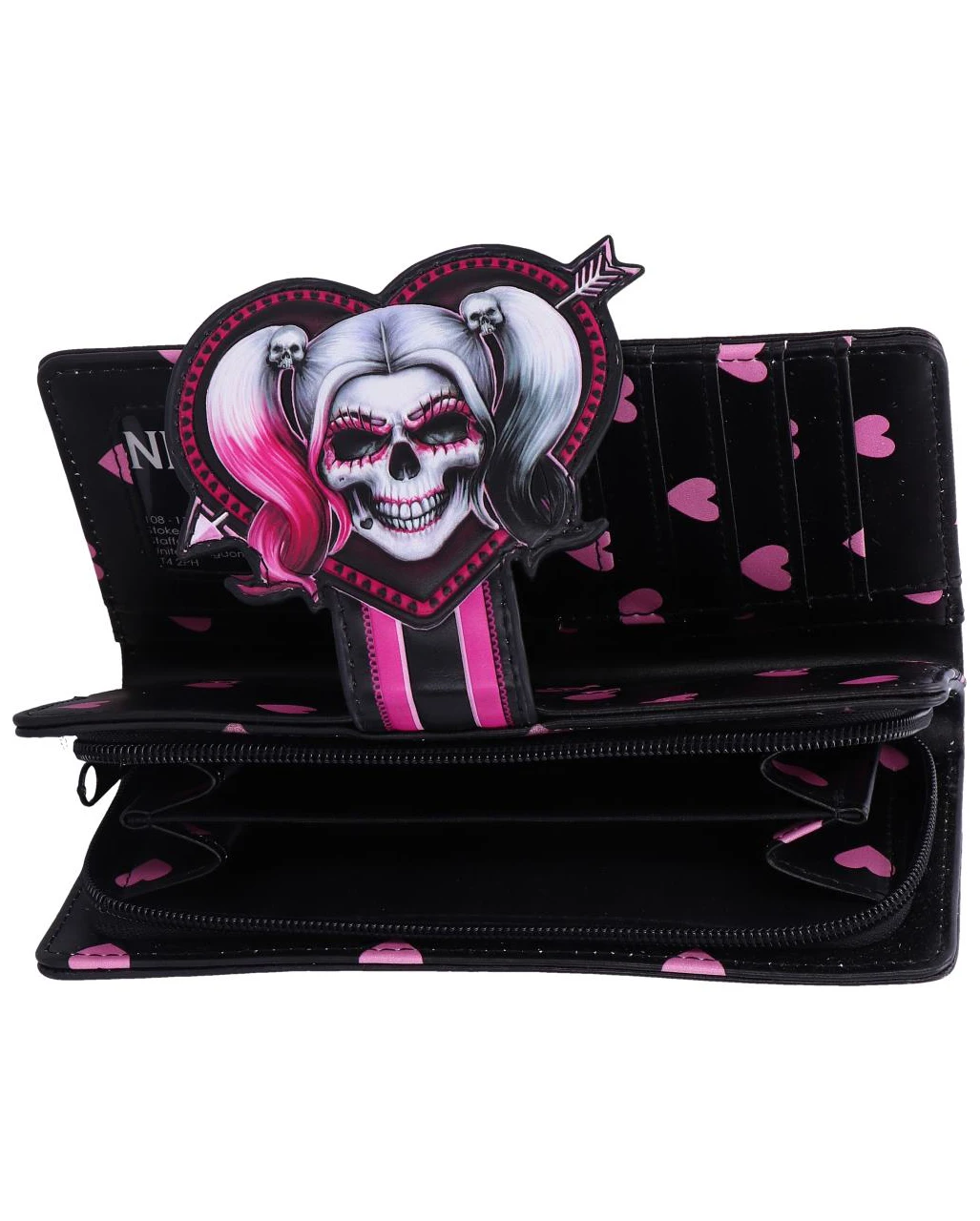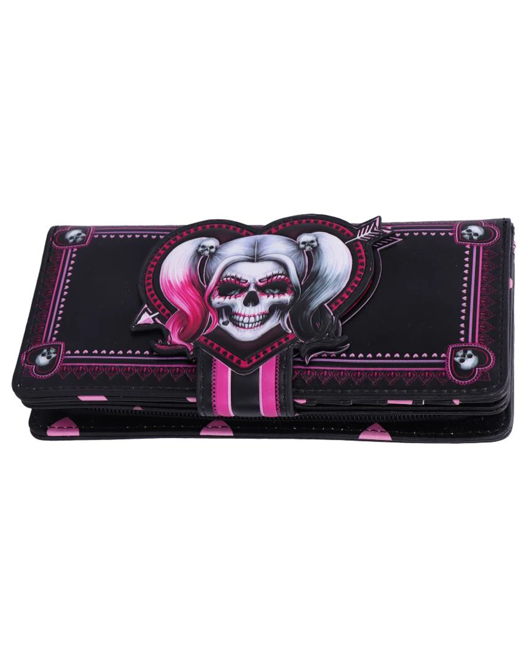 Unser Harley Quinn Little Monster Geldbeutel ist ein auffälliger Eyecatcher. Das Gothic Accessoire ist von der berüchtigten Superschurkin inspiriert und startklar, um dich bei deinen nächtlichen Eskapaden zu begleiten. Die Schwarz-Pink designte Geldbörse zeigt einen Quinn Schädel mit zu Zöpfen gebundenen Haaren, die mit Totenkopfklammern gehalten werden. Die rechte Seite ist bonbonrosa gefärbt, die linke tiefschwarz.