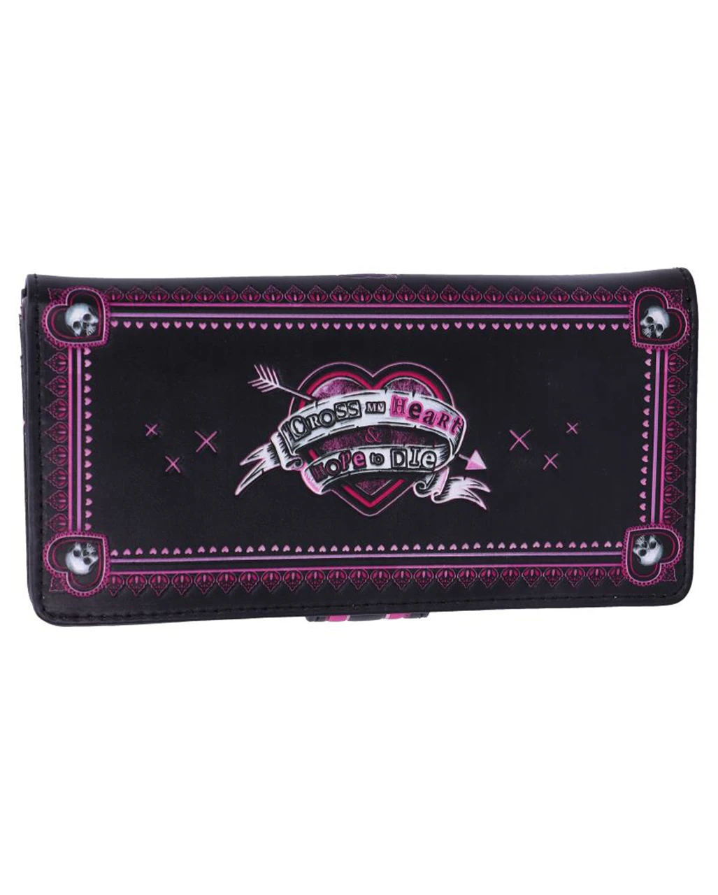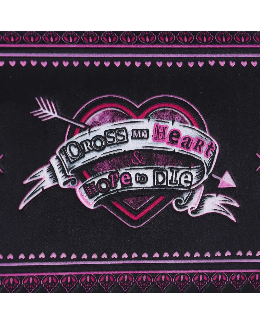 Der Harley Quinn Little Monster Geldbeutel ist 18,5 cm groß und in den Farben Schwarz, Pink und Weiß designt. Auf der Rückseite des geprägten Harley Quinn Portemonnaies ist ein Dolchherz mit den Worten „Cross My Heart Hope To Die“ abgebildet. Viele Fächer bieten Platz für Scheine, Münzen und Karten. Mit diesem schicken Harley Quinn Accessoire ist dein Geld sicher aufbewahrt. Lass dir auch den Little Monster Totenkopf nicht entgehen!