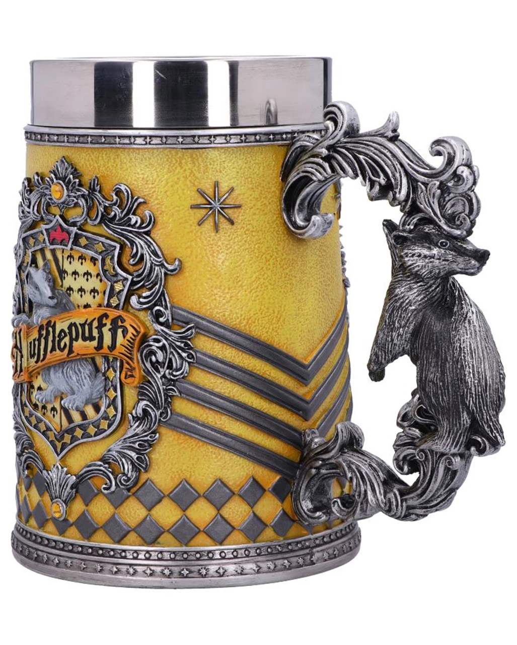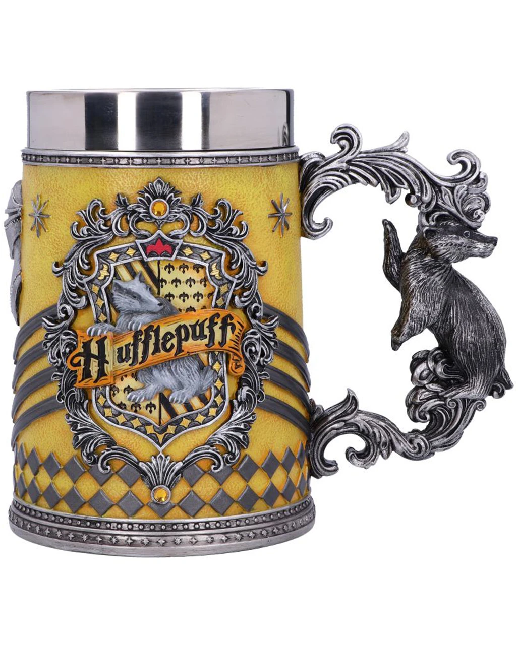 Ob zum Trinken oder als Highlight deiner Harry Potter Fanartikel Sammlung, der Harry Potter Hufflepuff Krug ist ein echtes Prachtstück. Das Wappentier ist der Hufflpuffs ist ein Dachs und genau diese ist im Wappen dieses schön gearbeiteten Stücks zu sehen ist. Die Hausfarben sind Gelb und Schwarz. Gegossen aus hochwertigem Polyresin, bevor der Harry Potter Hufflepuff Bierkrug fachmännisch von Hand bemalt wurde, ist dieser Sammlerkrug die perfekte Ergänzung für jede Harry Potter Sammlung und kann von Hexen, Zauberern und Muggeln gleichermaßen genossen werden. Der Bierkrug verfügt über einen Einsatz aus Edelstahl, was das Spülen erleichtert. Weitere tolle Merchandise Artikel findet ihr hier im Shop.
