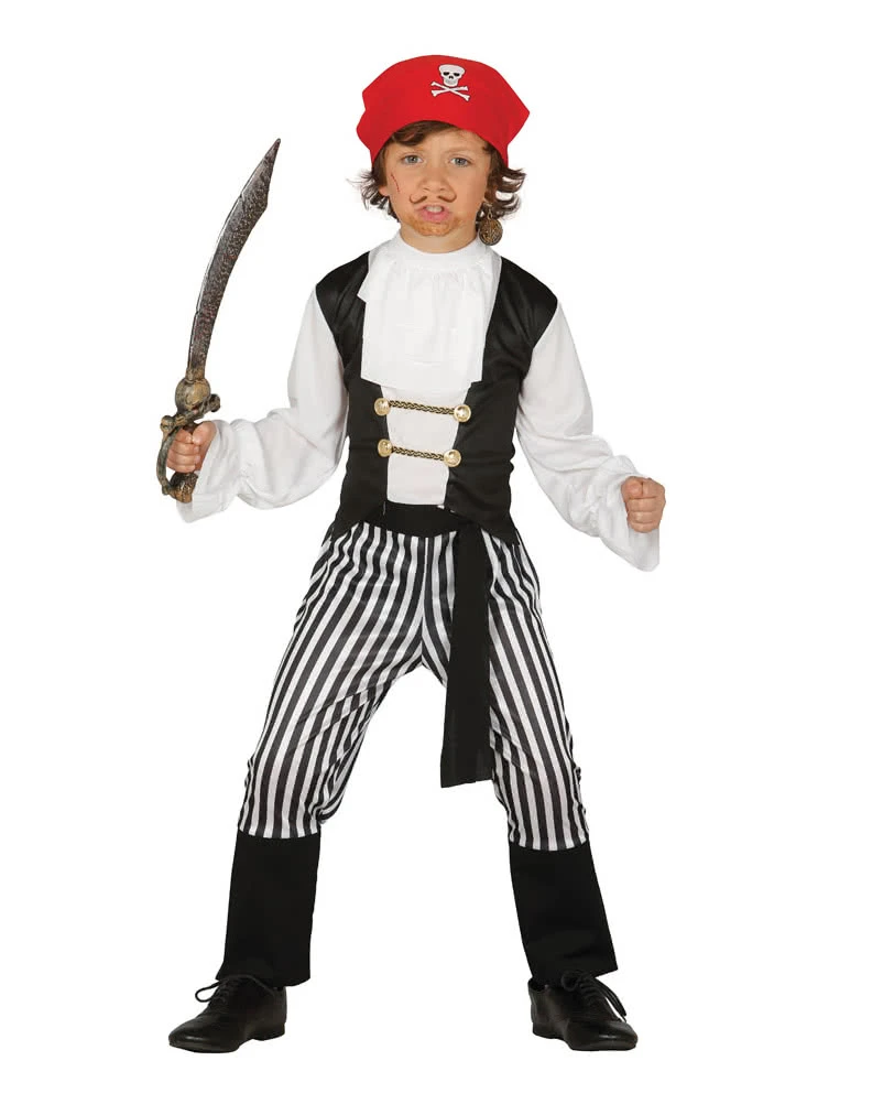 Das Kleiner Piratenkönig Kinderkostüm besteht aus einem roten Kopftuch mit einem aufgedruckten weiß-schwarzen Totenkopf, einem schwarzen Gürtel, einer weiß-schwarz gestreiften Hose mit Gummibund und schwarzen Stulpen, die Stiefelschäften ähneln, und einem weiß-schwarzen Oberteil. Auf das weiße Oberteil ist eine schwarze Weste aufgenäht, die vorne mit vier goldenen Knöpfen und zwei gold-schwarzen Zierkordeln verziert ist. Am Halsausschnitt ist ein dreilagiger weißer Jabot angenäht. An den Ärmeln sind vorne Gummizüge eingenäht, sodass die Ärmelenden elegant abstehen. Verschlossen wird das Oberteil mit einem Klettverschluss auf dem Rücken. Weitere coole Kinderkostüme wie das Firefighter Kleinkinder Kostüm und das Teenage Mutant Ninja Turtles Kostümbox findest du in unserem großen Sortiment.