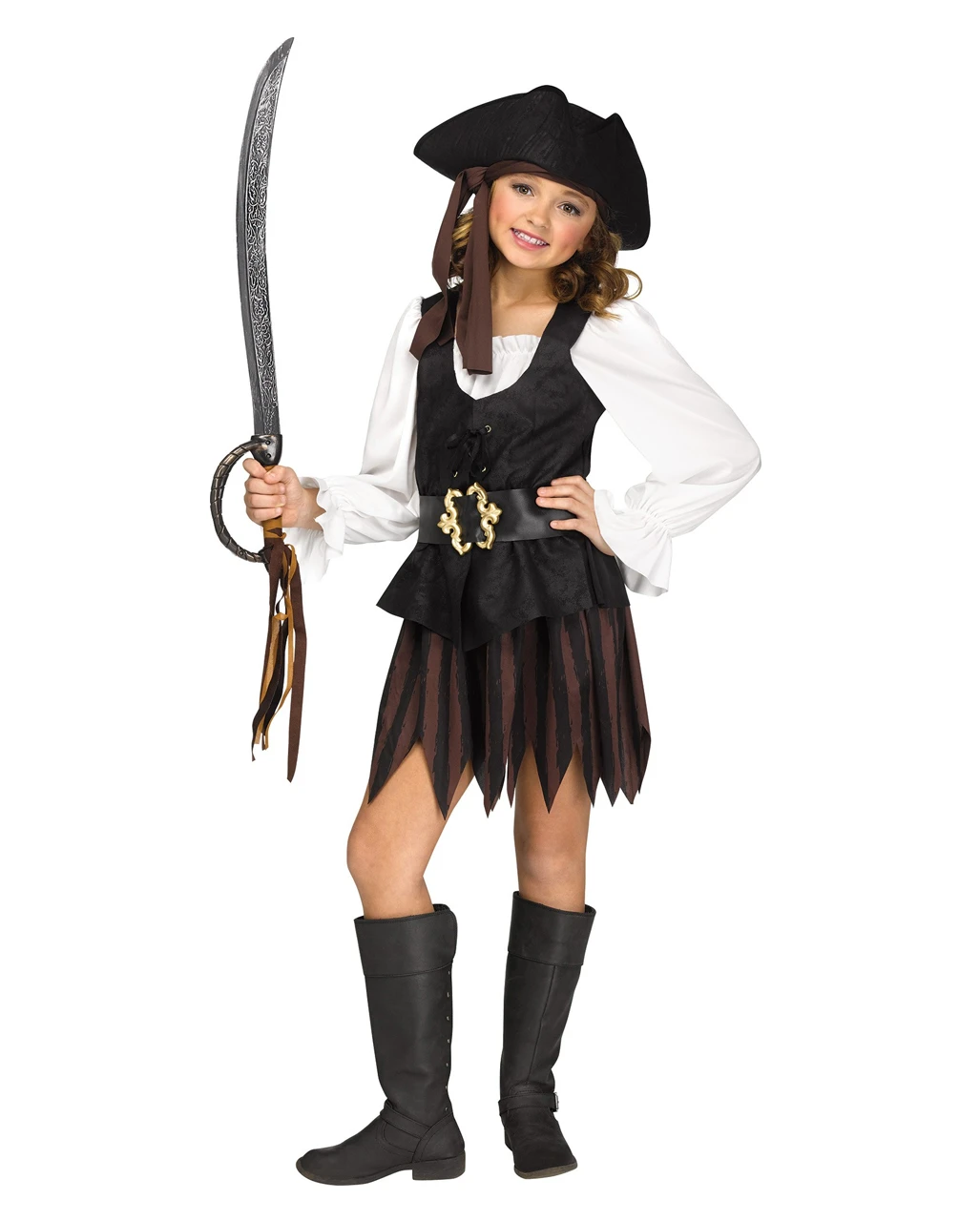 Ahoi! Vielleicht feierst Du ja auch Deinen nächsten Geburtstag unter dem Motto „Seeräuber und Piraten“. Was immer ihr auch im Schilde führt, das Mädchen Kostüm rustikale Piratin ist eine originelle Verkleidung für die Kinder-Faschings- oder die Kostümparty. Das Kostüm besteht aus dem braunschwarzen Kleid mit angenähter weißer Bluse, dem Piratenhut sowie dem passenden Gürtel mit dicker goldener Schnalle darauf. Natürlich fehlt auch das braune Band nicht, das Du unter dem Hut um die Stirn bindest, nicht bei diesem tollen Kostüm Set einer echten Piratenlady. Der Piraten Schwert aus Schaumstoffwürde das ganze dann natürlich noch komplettieren.