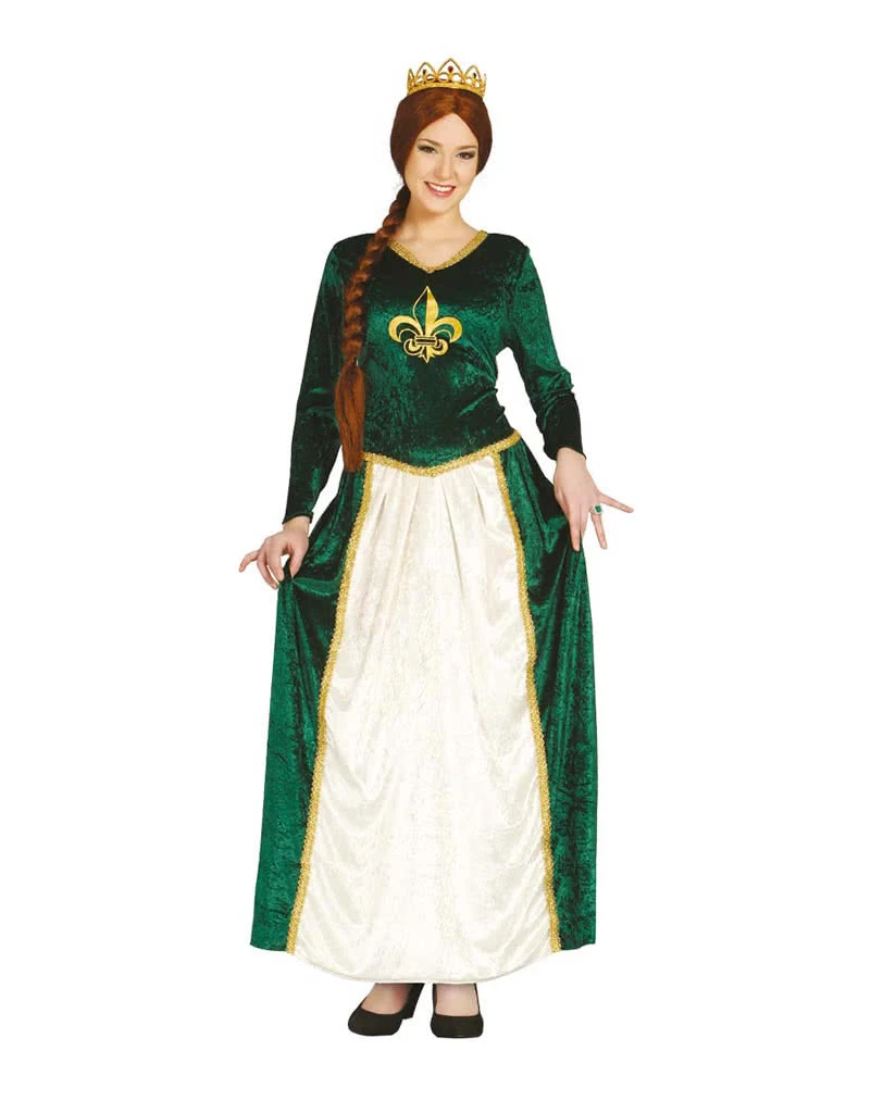 Das schöne Mittelalter Königin Kostüm besticht durch seinen schlichten Schnitt. Der weiche Stoff glänzt nicht nur dezent im Umgebungslicht, sondern weist mit seinen goldfarbigen Verzierungen am Kragen sowie auf Hüfthöhe auf den royalen Charakter der Verkleidung hin. Wie eine Schürze unterbricht der weiße Stoff das ansonsten in grüner Farbe gehaltene Gewand einer Königin. Auf der Brust prangt eine goldfarbenen Abbildung einer Schwertlilie. Zwei schmale Stoffbänder an der Hüfte dienen dazu, das Kleid der Figur der Trägerin anzupassen. Zur Abrundung des Mittelalter Königin Kostüms darf eine Goldene Cindy Krone mit Edelsteinen einfach nicht fehlen. Damit der royale Charakter deiner Kostümierung hervorgehoben wird, erweitere sie um ein Königszepter.
