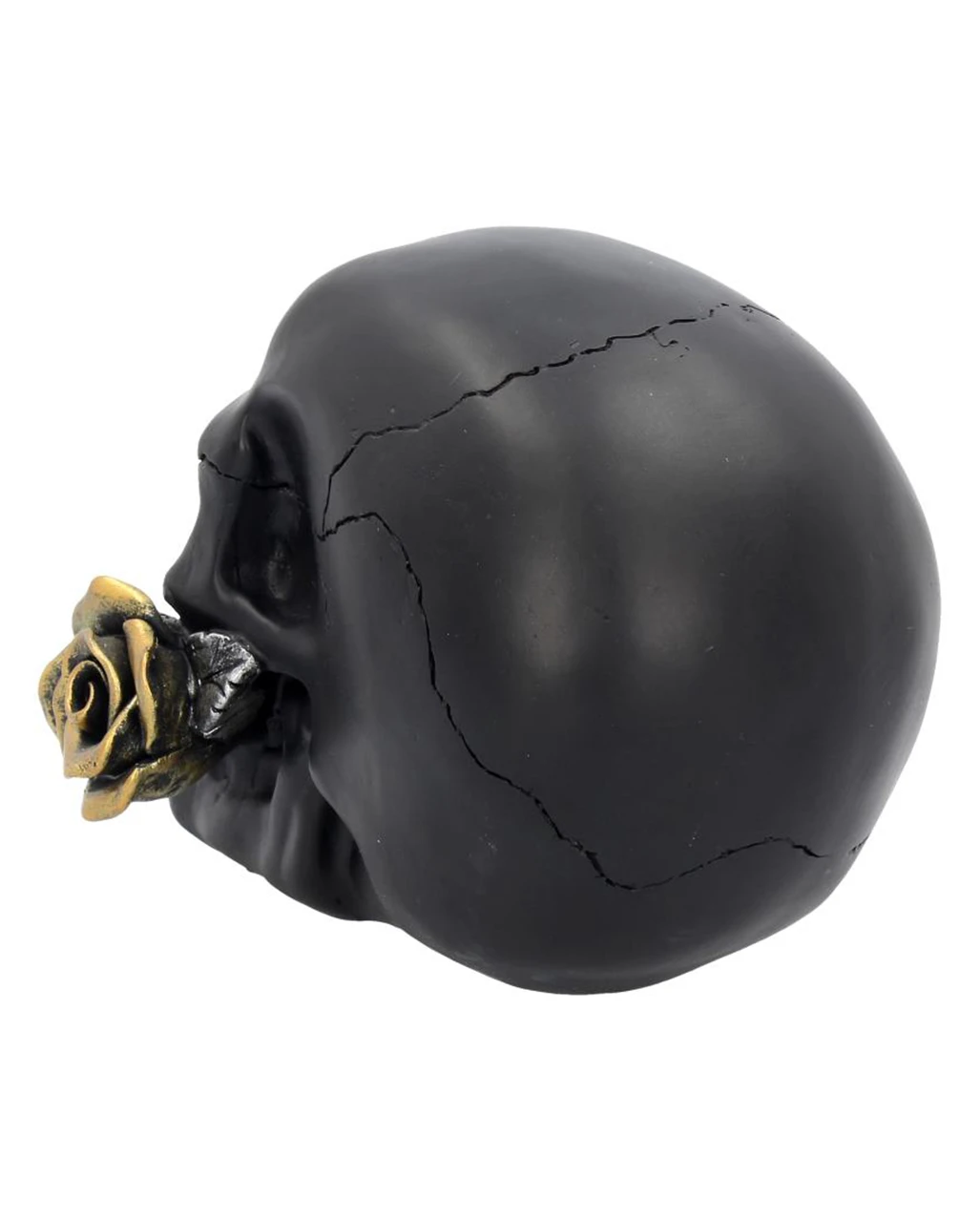 Gegossen aus feinstem Polyresin und anschließend liebevoll handbemalt, ist dieser schwarze Totenschädel mit goldener Rose die perfekte Ergänzung für dein alternatives Zuhause