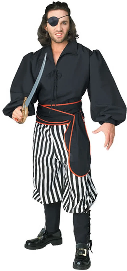 Das Seeräuber Herrenkostüm besteht aus dem schwarzen Hemd mit weiten Ärmeln, der schwarz/weiß gestreiften Hose und einer Schärpe. Zudem befindet sich an dem schwarzen Hemd eine Schnürung. Die Schärpe wird lässig über die Hüfte gebunden. Um dein Seeräuber Herrenkostüm zu komplettieren ist die Satin Freibeuter Augenklappe und die Piraten Pistole Echtholz das passende Accessoire.