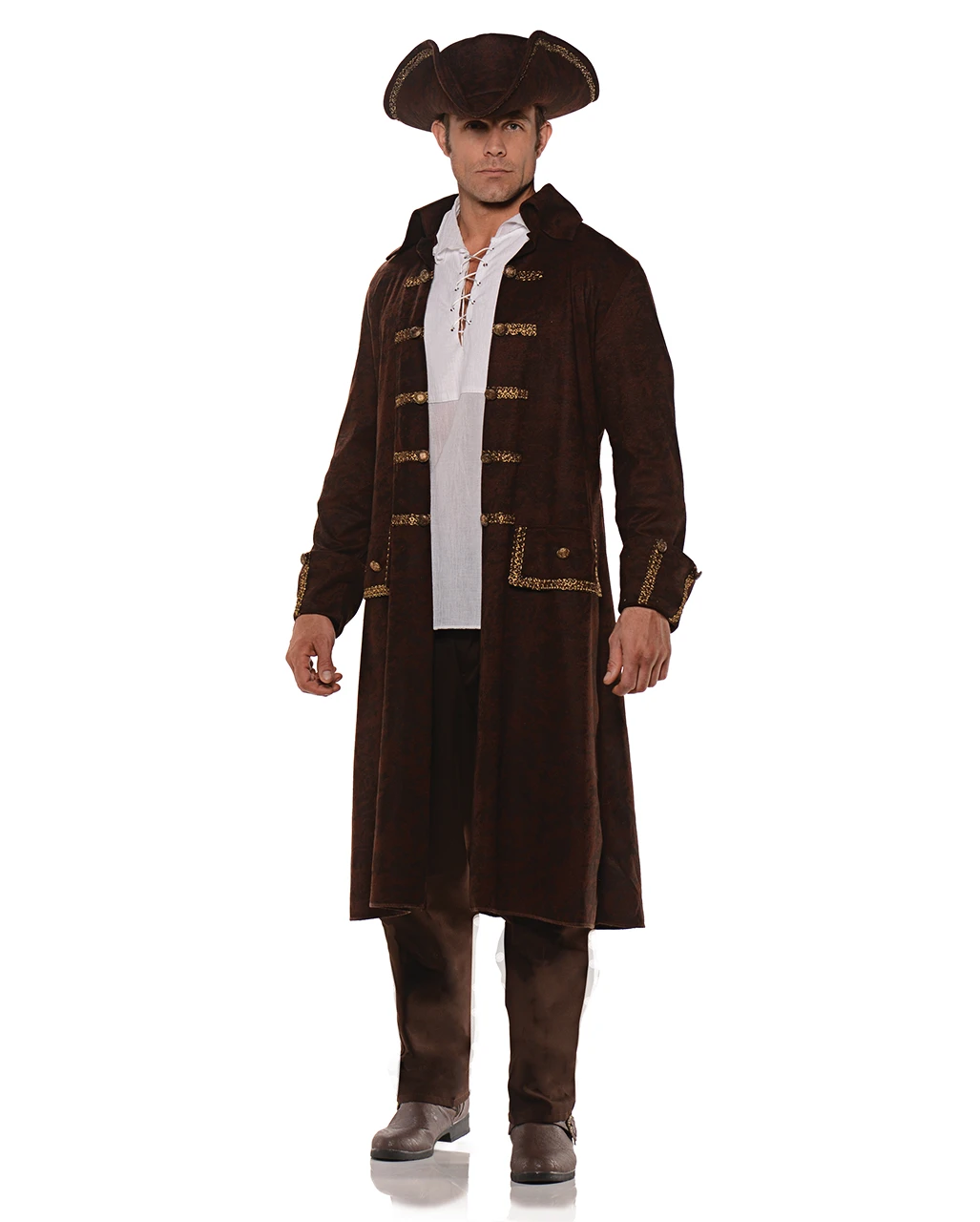 Der braune, mehr als knielange Seeräuber Kostüm Mantel besticht durch seine edle Gestaltung: Golden gefärbte Borten ziehen sich in regelmäßigen Abständen von den Knopflöchern des Jackets zu den Knöpfen und umrahmen die beiden Taschen des Kapitäns Mantels. Der mitgelieferte Piraten Hut kann zum klassischen Dreispitz geformt oder als sichelförmiger Admiralshut getragen werden und weist ebenfalls goldene Verzierungen an der Krempe auf. Dazu empfehlen wir das Piratenhemd mit Rüschenkragen und die Kniebundhose Schwarz aus Samt.