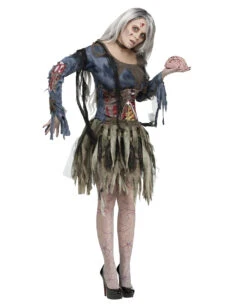 Das 3D Zombiekostüm für Mädchen hat zwei Kostümteilen, das Zombiekleid selbst und einen makaberen Gedärmgürtel. Das Oberteil des 3D Zombiekostüms wurde aus blauem Stoff gefertigt, als Verzierung dienen grauen Gazen am Kragen und ekelhafte, graue Knochen und Sehnen an den Ärmeln. Der Zombie Kostüm Rockteil besteht aus zahlreichen, grauen Fetzen. Das gesamte Zombie Outfit wirkt durch die Gedärmapplikation um den Bauch besonders unheimlich. Der Grusel Effekt des sexy 3D-Zombiekostüms für Frauen wird mit einer Zombie Bein Handtasche und noch ein wenig Spezial FX Kunstblut erhöht, sodass die Zombie Verkleidung zum Blickfang aller Halloween, Horror und Zombie Events wird.
