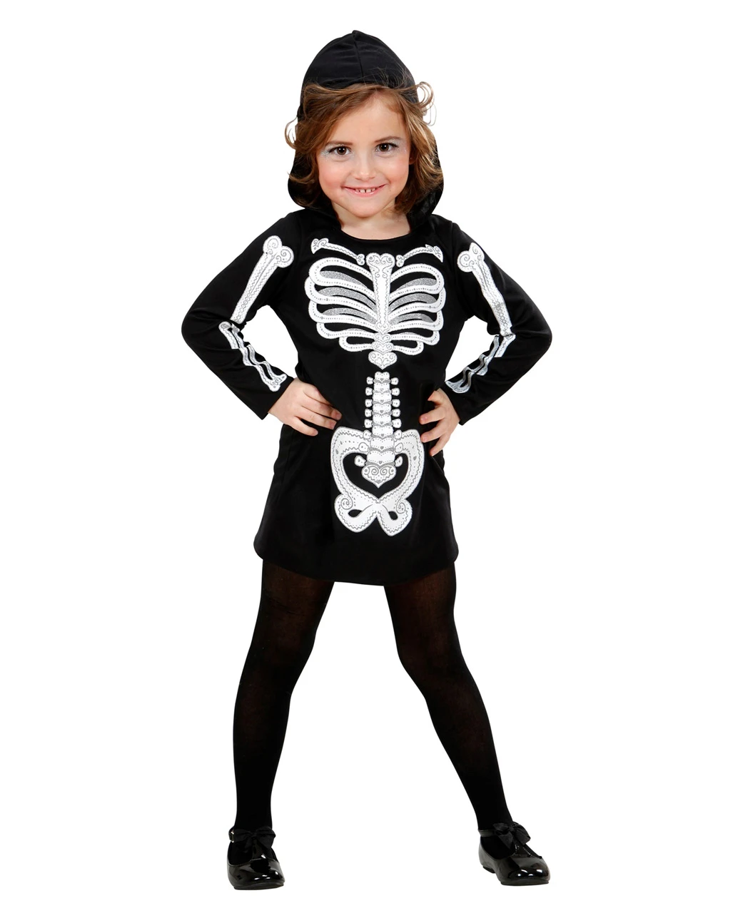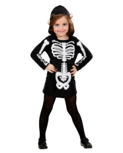 In unserem Skelett Glamour Mädchenkostüm macht der Trick or Treat richtig Spaß. Die Nachbarn machen der Kleinen die Taschen voll mit Süßigkeiten, wenn sie als kleines Skelett durch die Straßen hopst. Das glitzern und funkeln die Knochen und die Kleine strahlt übers ganze Gesicht, weil sie der Star der diesjährigen Gruselnacht ist. Auch für den Kinderfasching in der Kita ist das Kostüm eine zauberhafte Idee. Zauberhafter und liebenswerter hat eine Horror Gestalt noch nie ausgesehen.