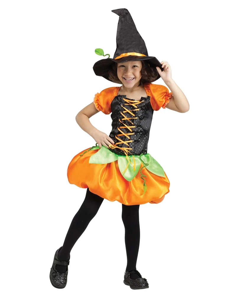 Das Kostüm der Süssen Kürbis Hexe besteht aus einem Kleid und einem Hexenhut. Das Kleid hat ein schwarzes Oberteil orangenen kurzen Puffärmeln. Vorne hat es eine orangene Schnürung sowie silberne Pailletten. Der mit Schaumstoff gefüllte orangene Ballonrock aus satin-artig glänzendem Stoff wird von einer Reihe grüner Stoff-Blätter verziert, die vorne an der Hüfte entlang festgenäht sind. Einige Kürbis-Ranken sind ebenfalls am Kleid zu erkennen. Auch am schwarzen Hexenhut ist solch eine Ranke befestigt. Weitere Kürbiskostüme für Mädchen sind die Kürbis Prinzessin Mädchenkostüm, das Kürbisbeet Hexen Kinderkostüm Gr. L und ein Süßer Kürbis Babykostüm.