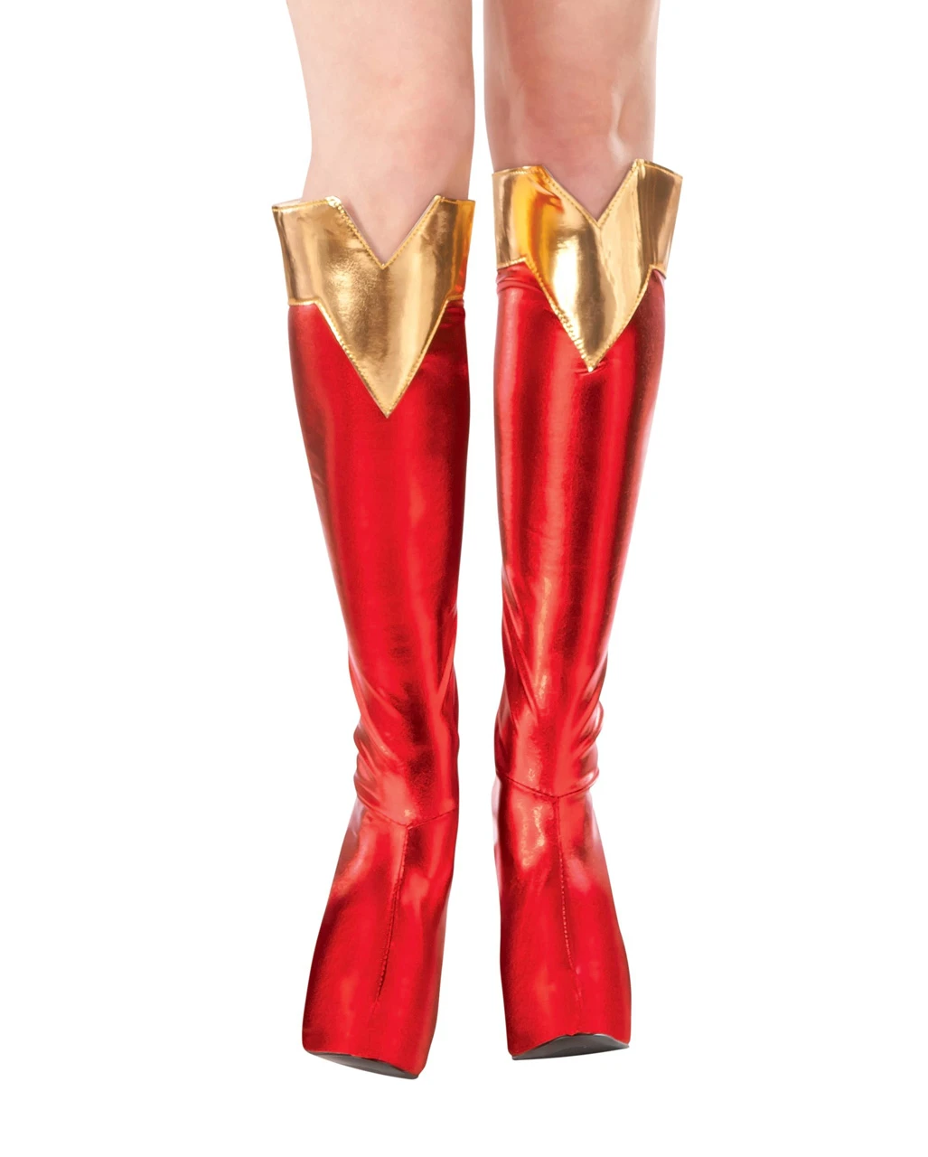 Die Supergirl Stiefelüberzieher bestehen aus einem seidig glänzenden roten Stoff mit goldenem Abschluss in V-Form. Ein schwarzes elastisches Band mit Klettverschluss an der Unterseite hält die Schuhüberzieher an Ort und Stelle. Als schickes Zubehör passen die Supergirl Stiefelgamaschen besonders gut zu dem Supergirl Stretch-Minikleid sowie zu dem Sexy Supergirl Corsagen Kostüm – darin bist du auf Comic Conventions & Faschings Partys ein echtes Highlight.