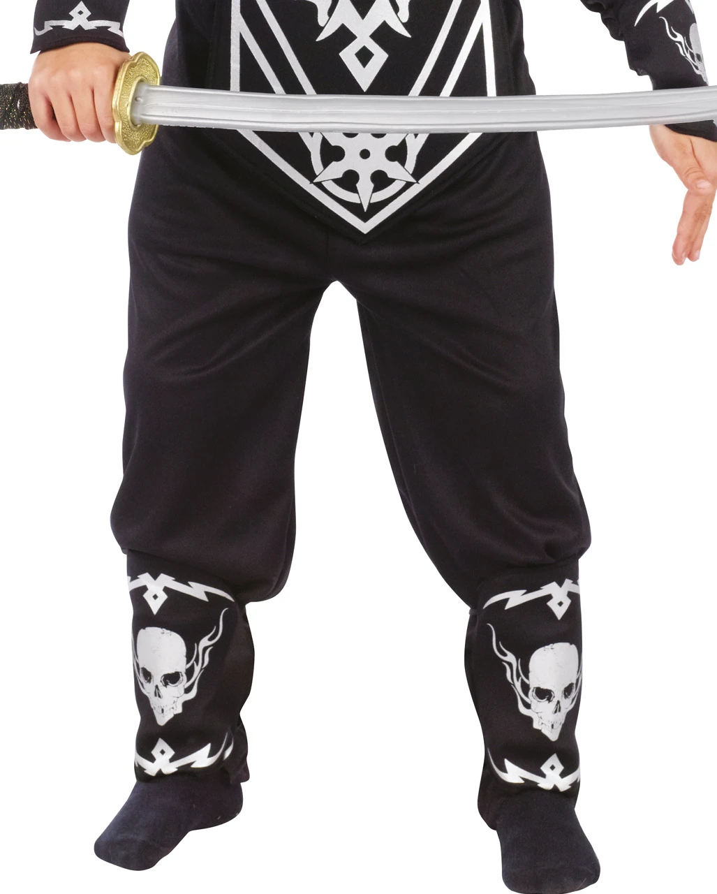 - einen bedruckten Brustpanzer mit coolem Totenkopf und Wurfstern Print