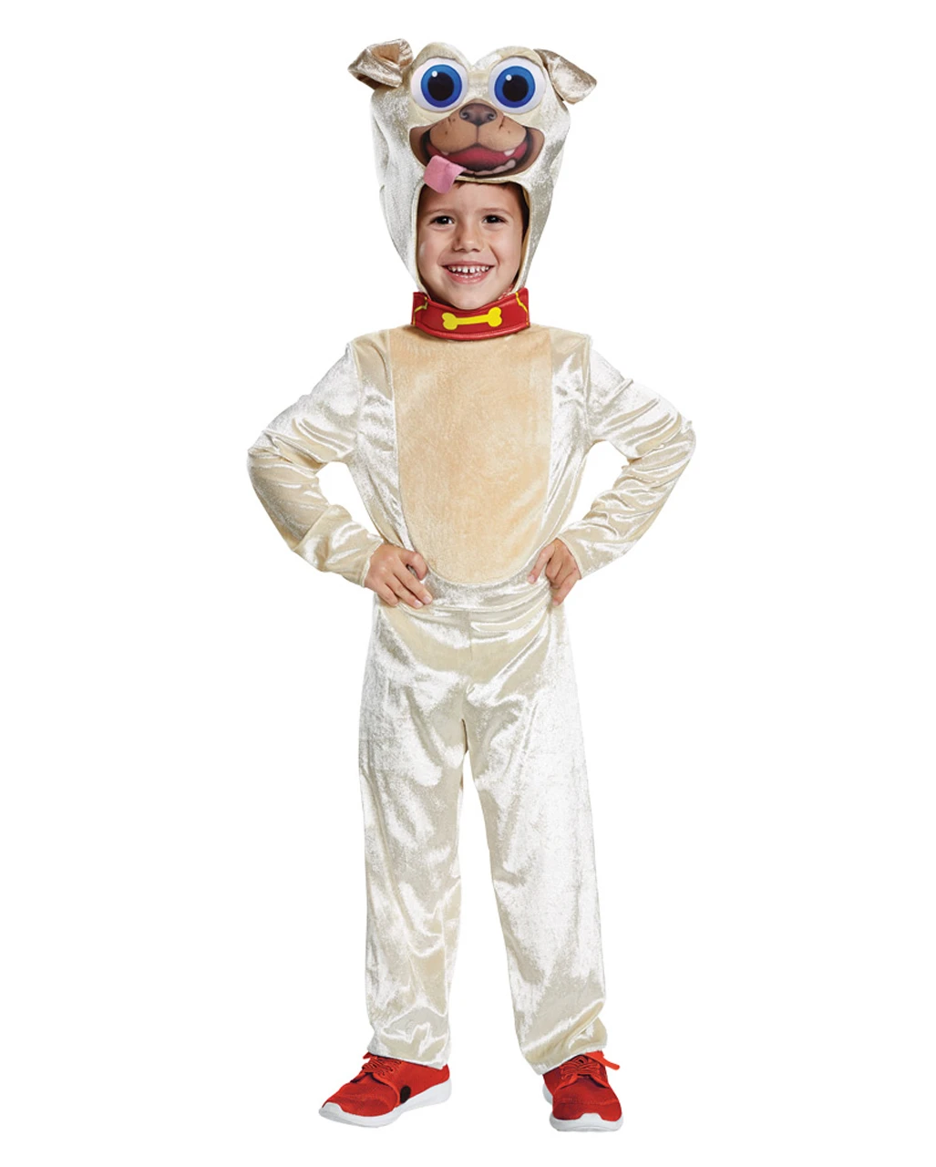 Du bekommst ein lizenziertes Welpen Freunde Rolly Kostüm bestehend aus einer Kinder Hunde Verkleidung, einer Mütze und einem Schwanz. Das bequeme Kinder Faschingskostüm von Disney hat ein rotes „Halsband“ mit gelbem Knochen am Kragen und eine große Hundemütze mit Gesicht und heraushängender Zunge. Ein Schwanz ist ebenfalls in der Lieferung enthalten. Du erhältst die Original Kinder Welpen Freunde Verkleidung deiner Filmstars in S-L Größe. Entdecke noch mehr Lizenz-Kostüme in unserem Onlineshop, wie z.B. das Plüsch Woofie Kinderkostüm Large