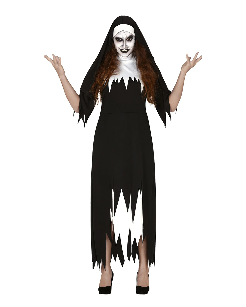 Unser Zerlumptes Nonnen Kostüm für Damen ist in Größe L verfügbar und besteht aus weichem Material. Die unheimliche Nonnen Verkleidung besteht aus einem schwarz-weißen Ordensschwester Kostüm und einem zerlumpten Schleier mit Zick-Zack-Fetzen. So abgeranzt bist du für Zombie Walk & Horror-Fete bestens gerüstet. Das richtige Horror-Make-up kreierst du mit dem Zombie Schmink Set 8-tlg.
